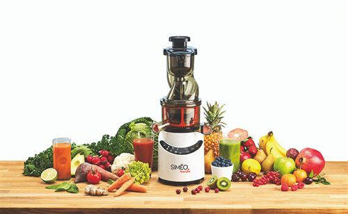 Ele tritura delicadamente frutas e vegetais com uma rosca sem-fim, extraindo suco fresco e delicioso.