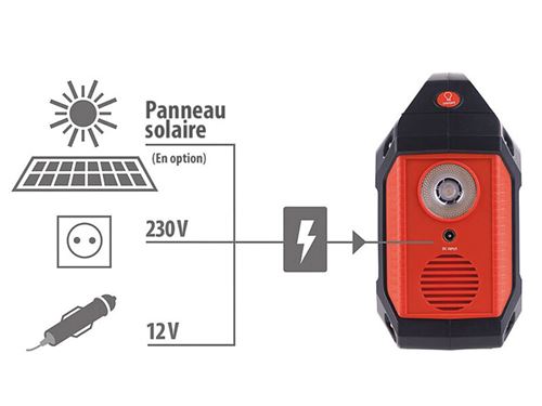 Recarregável via tomada, isqueiro do carro e energia solar