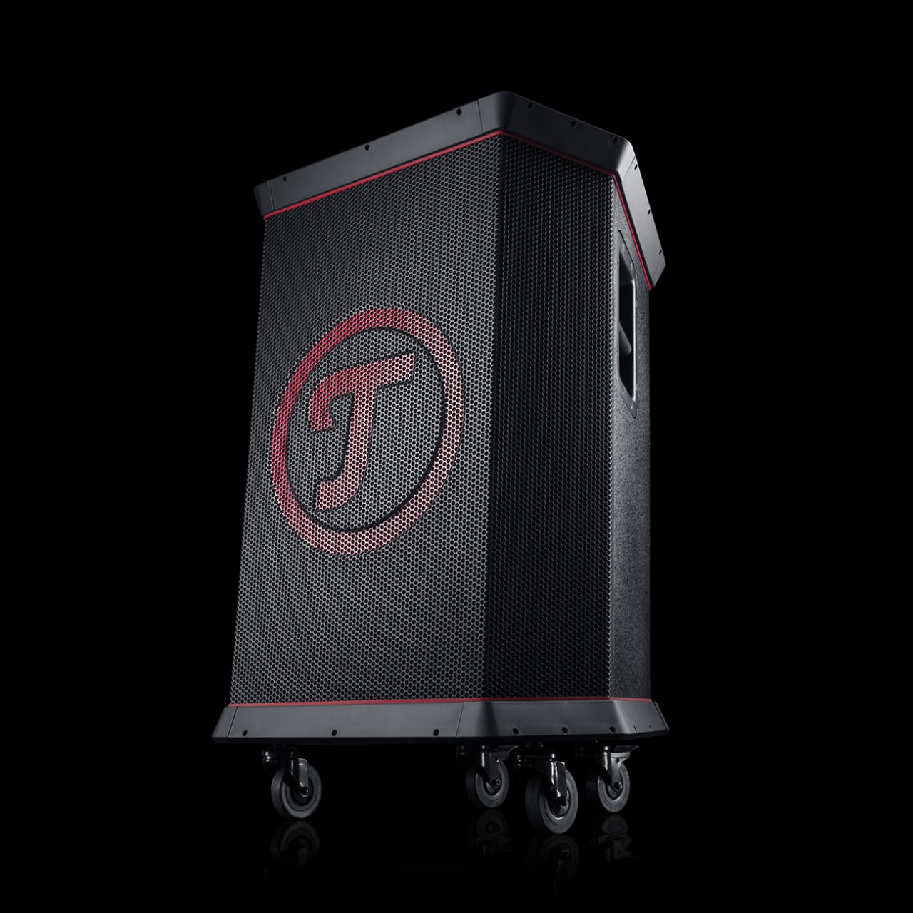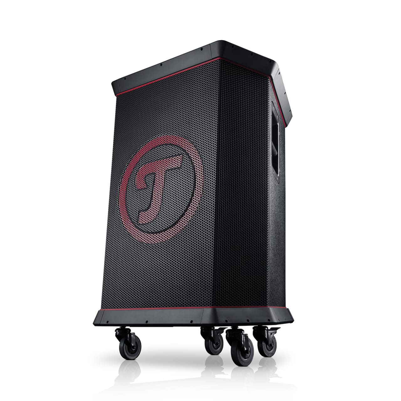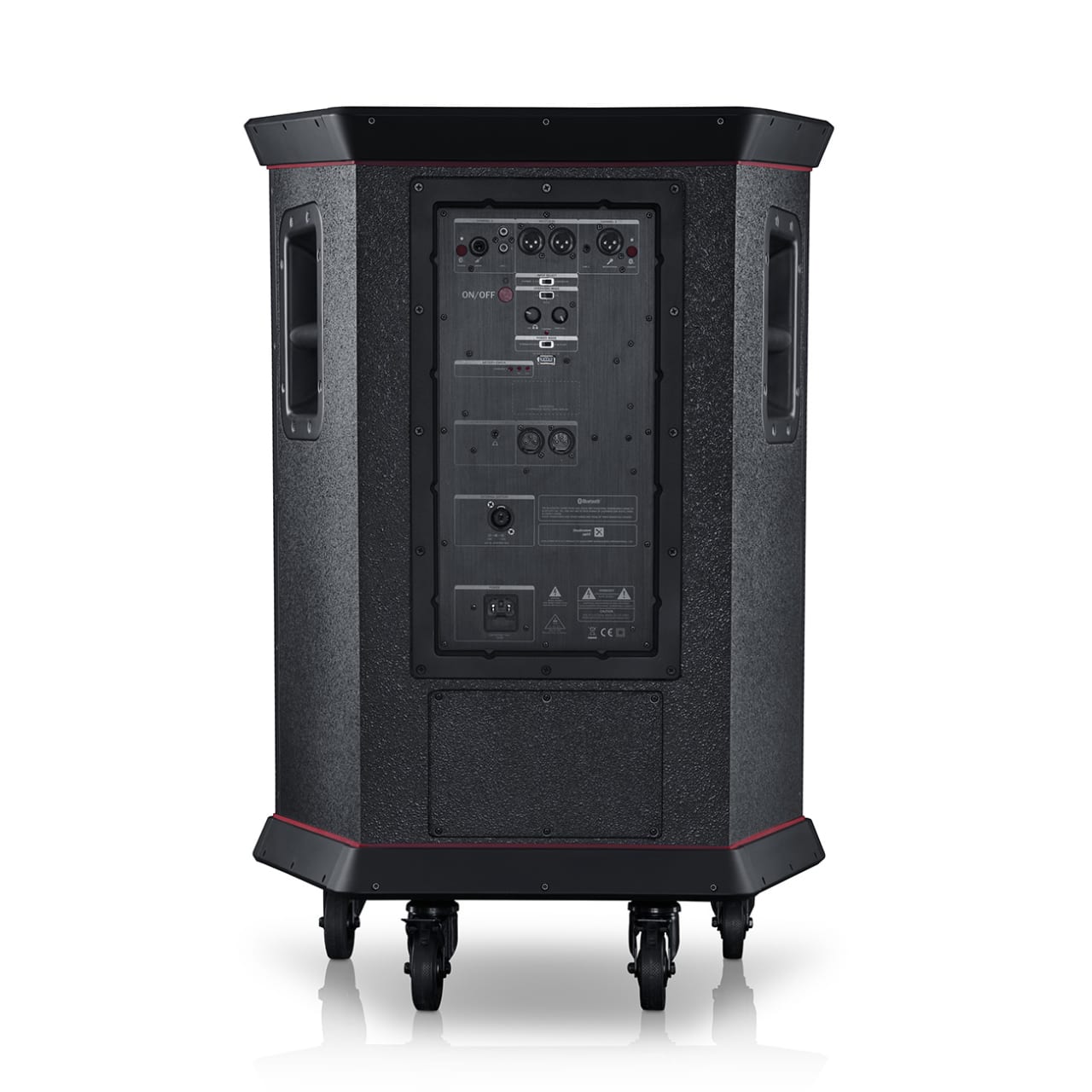 Amplificador Classe D e AB de 450 watts, woofer de 380 mm e tweeter de corneta para alto volume com consumo mínimo de energia.